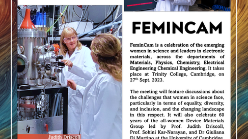 The FeminCam conference was held at Trinity College, a 1-day event to celebrate women leaders in the field of electronic materials, organised by the members of the Department of Materials Science & Metallurgy Device Materials Group (DMG), Prof. Driscoll, Prof. Kar-Narayan and Dr Di Martino. The event featured 10 amazing talks by women PIs in Cambridge, which focused on their research as well as their unique experiences as women in science. The event finished with a roundtable discussion which featured questions from the audience directly (so many that we could only get through a portion of them!). Over 100 people attended the event, everyone contributing and participating in the discussion in an inspiring and thought-provoking day. The DMG will produce a document to report the main points, comments, and thoughts from the event, in order to demand institutions and communities to take action and make progress on EDI matters - so watch this space!